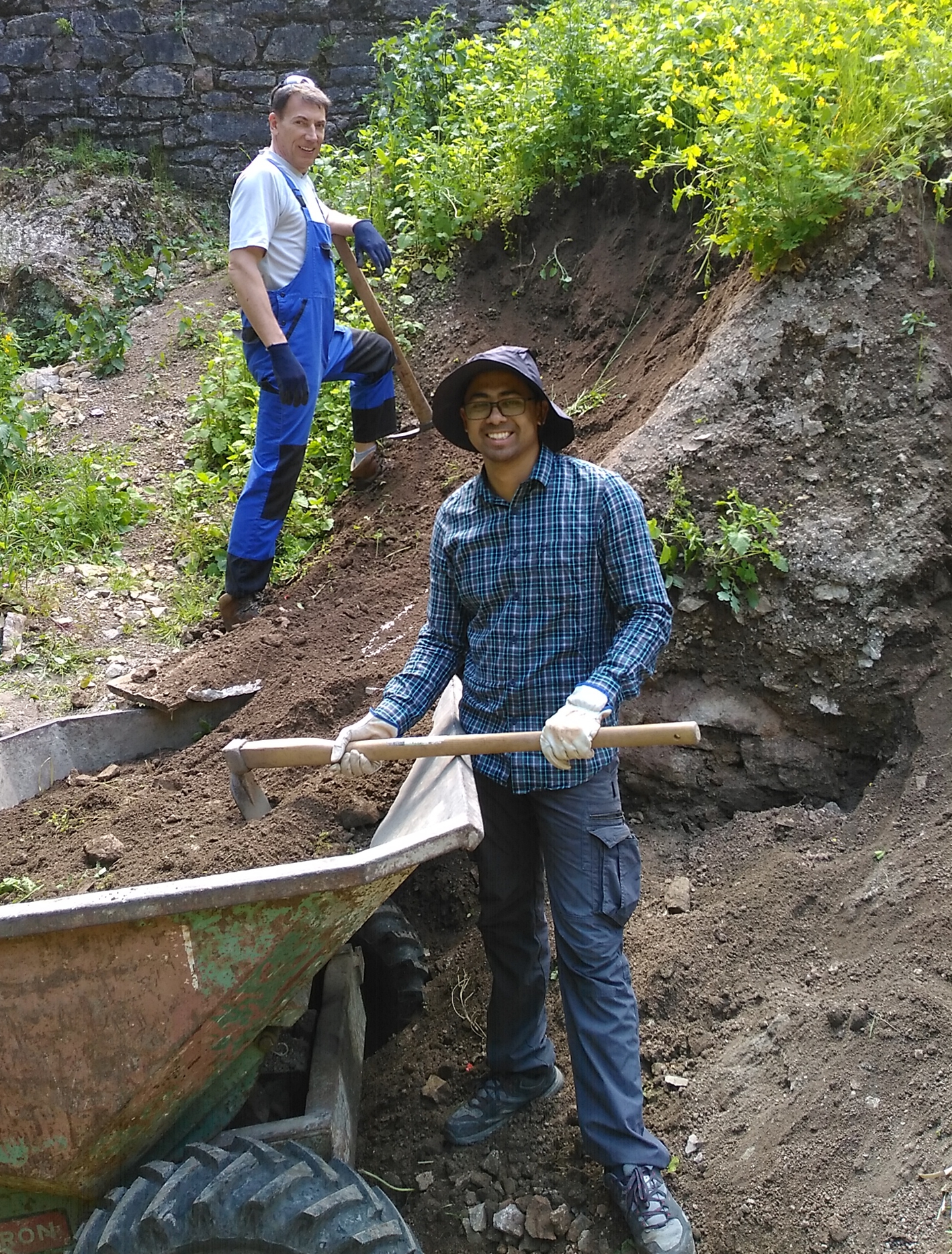 Andreas legt den Fundamentfuß der Umfassungsmauer nahe der Abbruchkante frei: